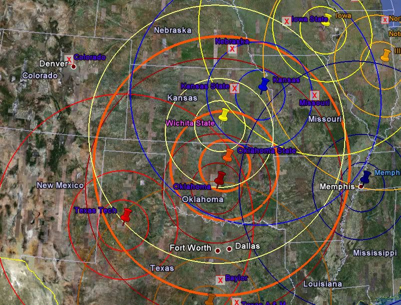 That map's useful - for instance, there's a recruit from Altamont, KS, and the map tells me he's within 150 of us and Kansas, but he's outside of the 70-mile radius of you and Kansas, so I'm not at a big distance disadvantage.