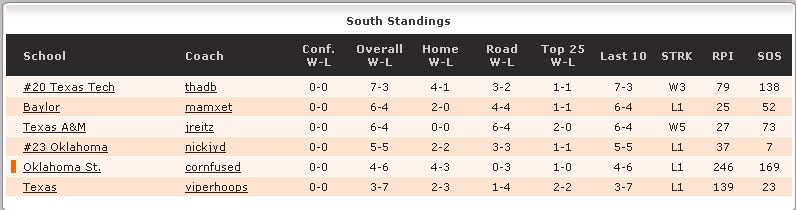 Seven games in, I'm 3-4 and RPI 199 - not bad for my first year on the job. The problem: I'm currently fifth in my division, and #6 is none other than Texas, who will be picking themselves out of their slump eventually. So I'm gonna be last, but hey, I expected that.
