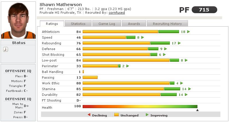 To start, though, I jumped on a solid SG (PG, really) that Baylor had vulnerable. Baylor put up a small fight, but the Bears really had bigger fish to fry and Kirschbaum fell into my hands. Again, he's strong in my Big Four, so that's great, as are his potentials. WE's a bit low for a redshirt, but that's what he'll be doing after Whittle and Whalen refused my RSing attempts.