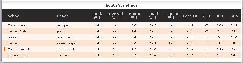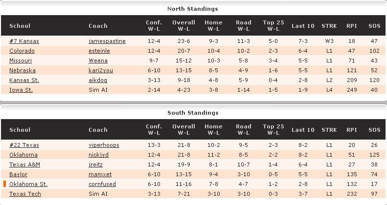 I turned it around a bit, winning my last two conference games to finish with my best season yet in terms of record, conf record, and RPI.  The Big 12 sends 4 to the NT, 2 to the PIT, which is strong, but not as strong as the ACC, Big Sky, Pac-10, or A-10.  A great year for the midmajors: the Big Sky, A-10, Horizon, C-USA, and MVC send a total of 22 teams to the Dance, while the SEC, Big East, and Big Ten combine to send... six.
