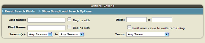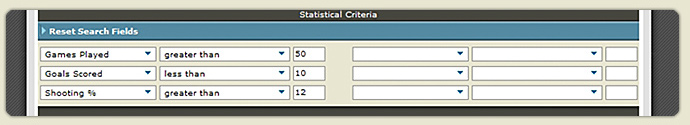 In addition to the standard fields, you can add criteria for player stats. Looking for a guy who played more than 50 games, scored less than 10 goals, and shot higher than 12%? Does your theme league have some crazy rules that used to make drafting a nightmare? Whatever you're looking for, you can specify up to six statistical requirements on your searches! ![]() When specifying statistical requirements, you may use decimals (such as 50.5), but do not enter symbols (such as %). The Draft Centre knows what to expect for each field. For percentage fields, do not use probabilities. For example, to enter forty-two percent, you could enter 42, or 42.0. Do not enter 0.42. |