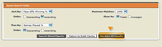 Say you want to ban all players with a defensive rating higher than 70. Clicking on each player individually would take forever! We've also made this easy for you. Simply specify the search options of the group of player you want to blacklist, then click the "Blacklist All Results" button. You'll be asked to give it a name. Make it easy for the other users to know which players you are banning. In this case I'd name it "Players with DefRating over 70." You can also click the "Search WhatIfSports" button first to see the players and make sure they are correct before you blacklist them. ![]() |